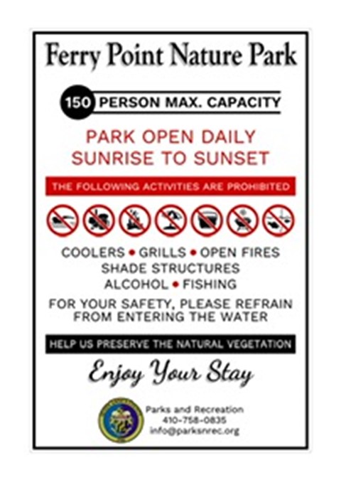 Ferry Point Park is a nature park, so please no coolers, grills, open fires, shade structures, or fishing.